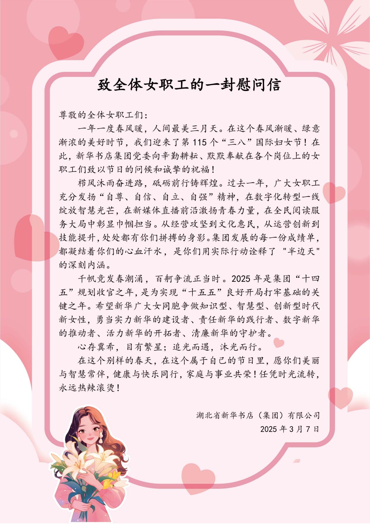 一年一度春風(fēng)暖,人間最美三月天。在這個春風(fēng)漸暖、綠意漸濃的美好時節(jié),我們迎來了第 115 個“三八”國際婦女節(jié)!在此,新華書店集團黨委向辛勤耕耘、默默奉獻在各個崗位上的女職工們致以節(jié)日的問候和誠摯的祝福!