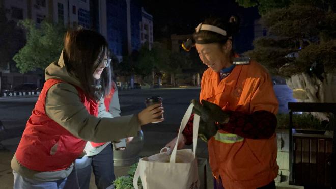 夜色闌珊,曙光未露。分公司志愿者們身著統(tǒng)一的紅色馬甲在連鎖店前集合,清點(diǎn)完畢后將慰問(wèn)物資搬至車(chē)上,乘車(chē)前往各慰問(wèn)點(diǎn)。經(jīng)理龔明帶領(lǐng)志愿者微笑著向正在忙碌工作的環(huán)衛(wèi)工人送上精心準(zhǔn)備的熱飲和面包,并表達(dá)誠(chéng)摯的問(wèn)候和感謝,環(huán)衛(wèi)工人們臉上都溢滿了驚喜與感動(dòng)。期間志愿者們還主動(dòng)幫助環(huán)衛(wèi)工人清掃路面、清理垃圾等,深刻感受到環(huán)衛(wèi)工作的艱辛與不易。