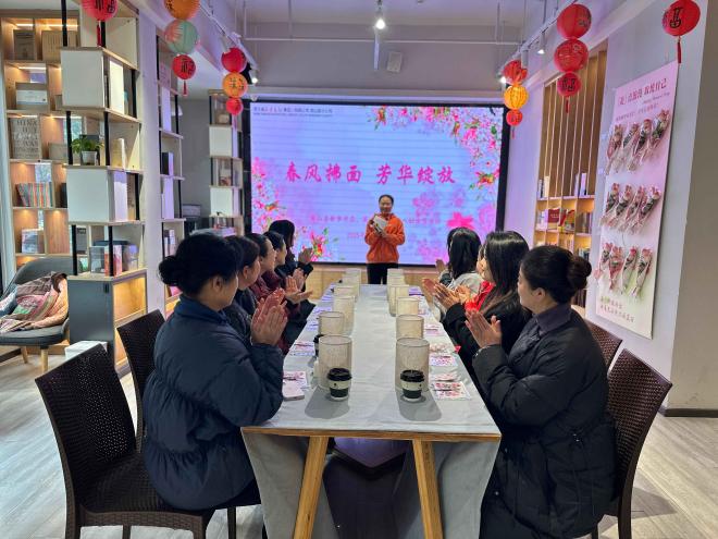 活動現(xiàn)場,《世界贈于你》的悠揚旋律與《巾幗頌》的鏗鏘詩韻交織回蕩。在非遺花燈制作區(qū),女員工們帶領(lǐng)讀者穿竹篾、糊絹紗,一盞盞 "玉蘭"" 墨梅 "造型的非遺花燈在指尖綻放,既傳承了傳統(tǒng)手工藝精髓,又融入了新時代女性的創(chuàng)新巧思。蜂蜜柚子茶 DIY 環(huán)節(jié)中,清甜茶香與歡聲笑語相互交融,勾勒出知識女性剛?cè)岵纳鷦尤合瘛;顒游猜暎w人員在" 典籍長河 " 主題墻前合影,鏡頭定格下文化使者們的自信風采。