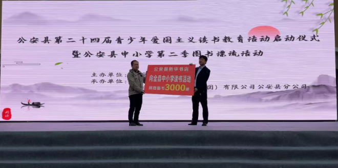 4月11日上午,由公安縣教育局主辦,新華書店公安縣分公司承辦的“長江大保護(hù) 荊楚譜新篇”公安縣第二十四屆青少年愛國主義讀書教育活動啟動儀式暨公安縣中小學(xué)第二季圖書漂流活動在當(dāng)?shù)囟泛绦W(xué)舉行。荊州市分公司經(jīng)理郭立斌,公安縣委宣傳部常務(wù)副部長施鵬程,公安縣教育局黨組書記、局長趙虎,荊州市分公司經(jīng)理助理蔣濤,公安縣分公司經(jīng)理龔關(guān),縣教育局黨組成員、副局長王世全,縣教育局黨組成員周珍春及全縣各中小學(xué)主要負(fù)責(zé)人共計(jì)140余人參加活動。