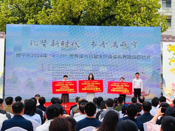 活動在舞蹈《舞動春潮滿香城》中正式拉開序幕。好書推薦《中國榜樣》、詩朗誦《書香滿咸寧》等節(jié)目帶領觀眾沉浸式感受氤氳書香;李曉亮代表分公司向“優(yōu)秀閱讀推廣單位”“優(yōu)秀閱讀推廣校園”“優(yōu)秀閱讀推廣書屋”受贈代表分別捐贈10000元圖書,以實際行動推廣全民閱讀,助力“書香咸寧”建設;全民閱讀倡議人以快閃形式齊誦《2024年全民閱讀倡議書》,倡議市民、家庭、單位行動起來,與書為友,共享閱讀之美;現(xiàn)場市民共同見證咸寧市 2024年“4·23”世界讀書日暨全民閱讀系列活動啟動。