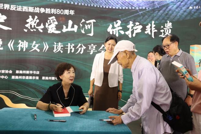 活動高潮部分是葉梅女士的分享與讀者互動。葉梅女士深情講述了《神女》的創(chuàng)作初衷、采風經(jīng)歷以及在書寫那段悲壯歷史時的深刻感悟。她特別提到恩施這片英雄土地和三峽壯美山河給予她的靈感與震撼,并圍繞“銘記歷史、熱愛山河、保護非遺”主題,與現(xiàn)場讀者進行了真摯而熱烈的交流。讀者們踴躍提問,表達了對作品的喜愛和對歷史的思考,現(xiàn)場氣氛莊重而溫馨。分享會后,葉梅女士熱情地為現(xiàn)場讀者簽名留念。