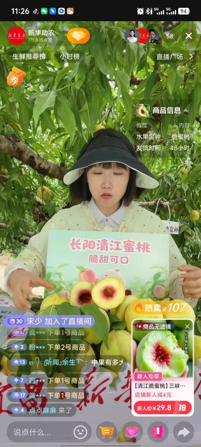 近日,宜昌分公司直播團(tuán)隊(duì)在長(zhǎng)陽(yáng)土家族自治縣漁峽口鎮(zhèn)趙家灣村,開(kāi)展“閱見(jiàn)山水 ‘桃’醉長(zhǎng)陽(yáng)”清江脆蜜桃專(zhuān)場(chǎng)助農(nóng)直播活動(dòng)。