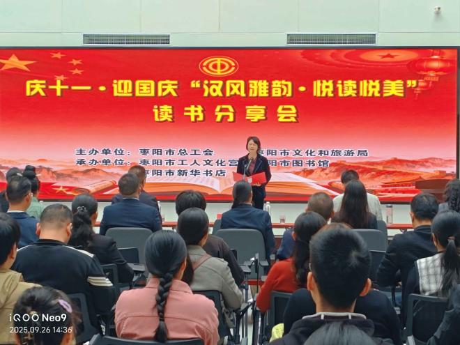 9月26日下午,在“十一”國慶佳節(jié)來臨之際,由棗陽市總工會、市文化和旅游局主辦,新華書店棗陽市分公司、市工人文化宮、市圖書館共同承辦的“慶十一·迎國慶——漢風雅韻·悅讀悅美”讀書分享會活動在市圖書館盛大舉行。棗陽市直各部辦委局工會工作者齊聚一堂,共同沉浸于這場傳統(tǒng)意蘊與濃郁書香交織的文化盛宴。