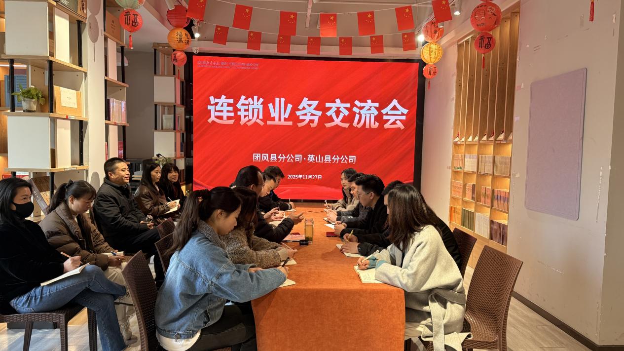 11月27日,團(tuán)風(fēng)縣分公司分管連鎖業(yè)務(wù)經(jīng)理蘇彬率連鎖店業(yè)務(wù)骨干一行來到英山縣分公司開展連鎖業(yè)務(wù)交流活動(dòng)。雙方圍繞業(yè)務(wù)拓展與運(yùn)營(yíng)提升等展開深入交流,共同探索發(fā)展新路徑。