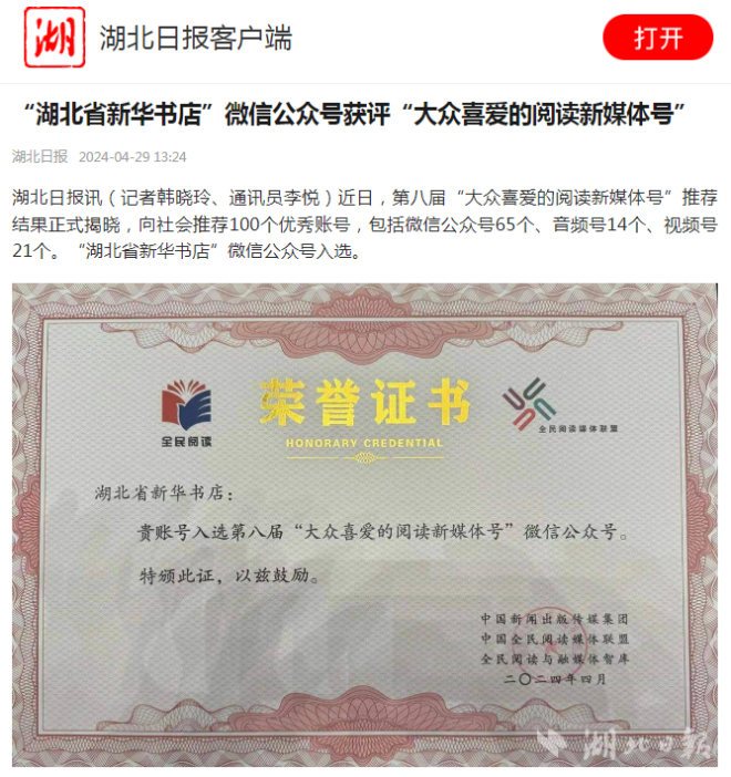 湖北日報客戶端?“湖北省新華書店”微信公眾號獲評“大眾喜愛的閱讀新媒體號”