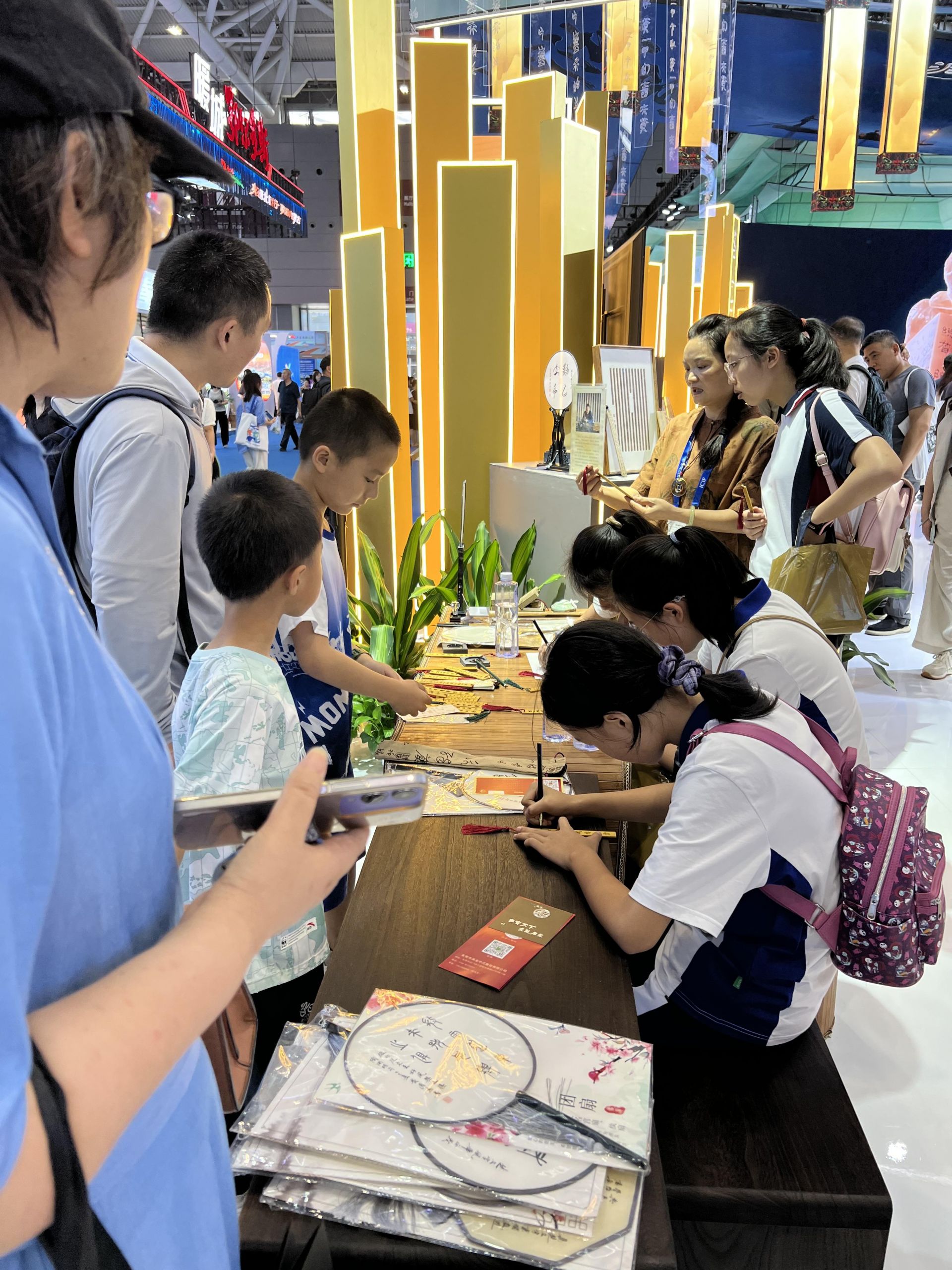 湖北館以“簡牘文化”為核心亮點。“最早的家書”獨具吸引力,展會期間,連續(xù)五天眾多參觀者慕名而來。尤其是深圳市中小學(xué)生們,在老師和家長的帶領(lǐng)下,非遺傳承人黃有志通過詳細講解介紹,讓師生和家長們?nèi)媪私夂痹茐羲⒌厍睾?、荊門郭店楚簡、荊州張家山漢簡等歷史、字體構(gòu)成等。大家親自動手復(fù)刻竹簡、木牘,沉浸式體驗漢字和荊楚文化的魅力。