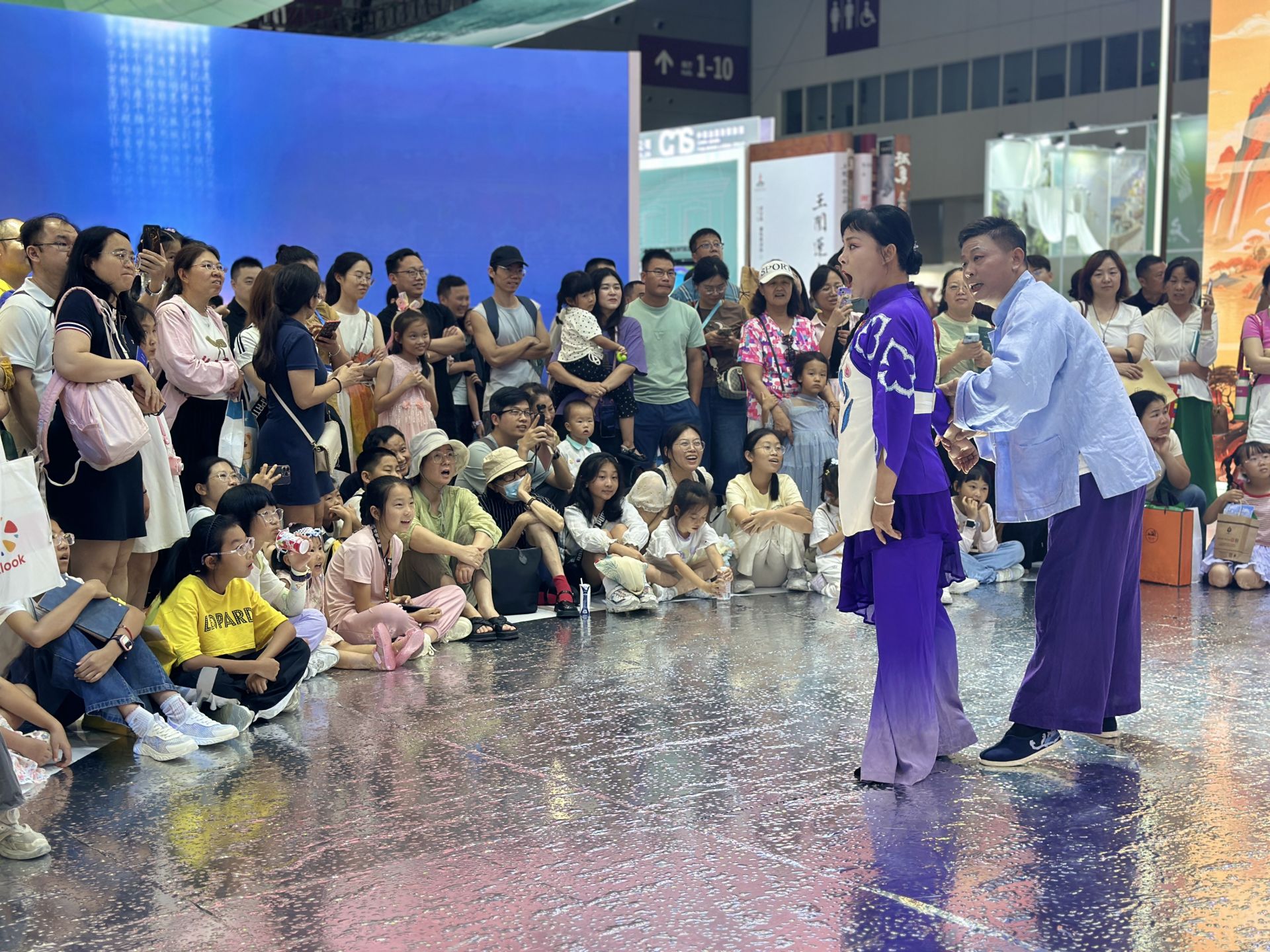 湖北的采茶戲、黃梅戲因其婉轉(zhuǎn)的唱腔,聲情并茂的表演,讓整個湖北館人氣爆棚。觀眾們自覺而有序地或坐或站,聽得津津有味。