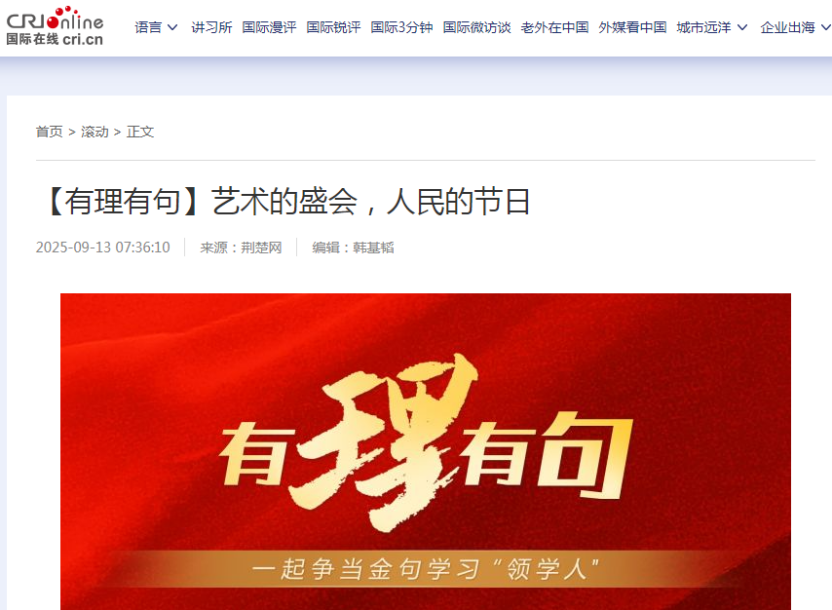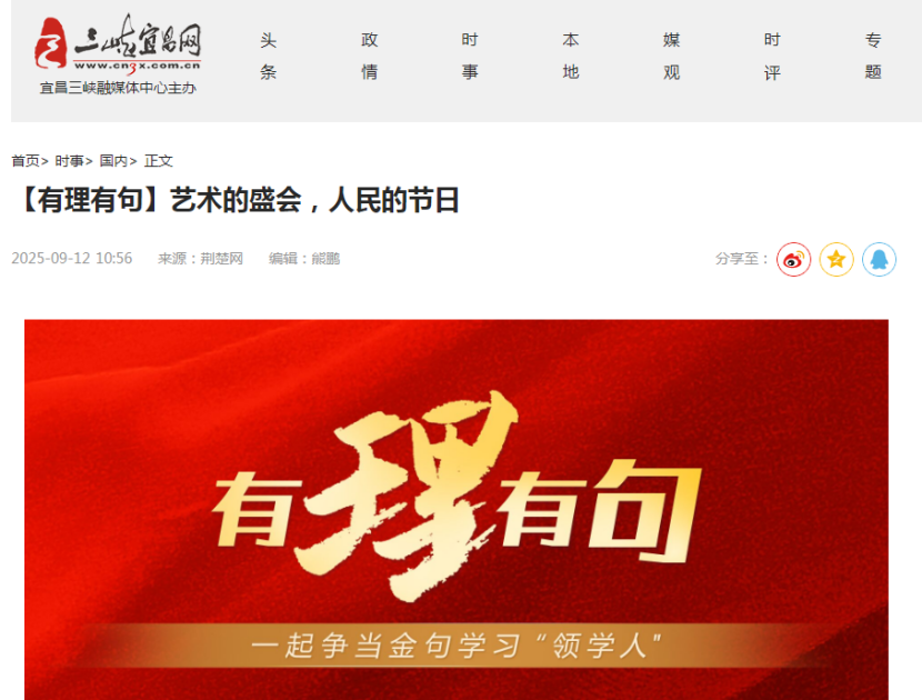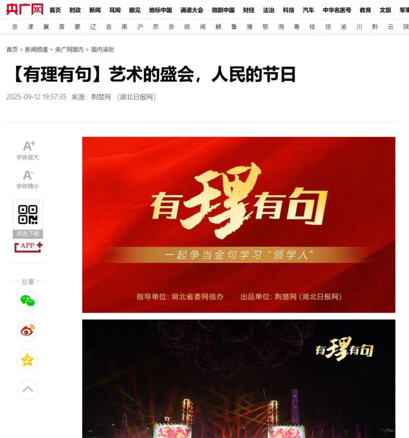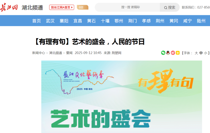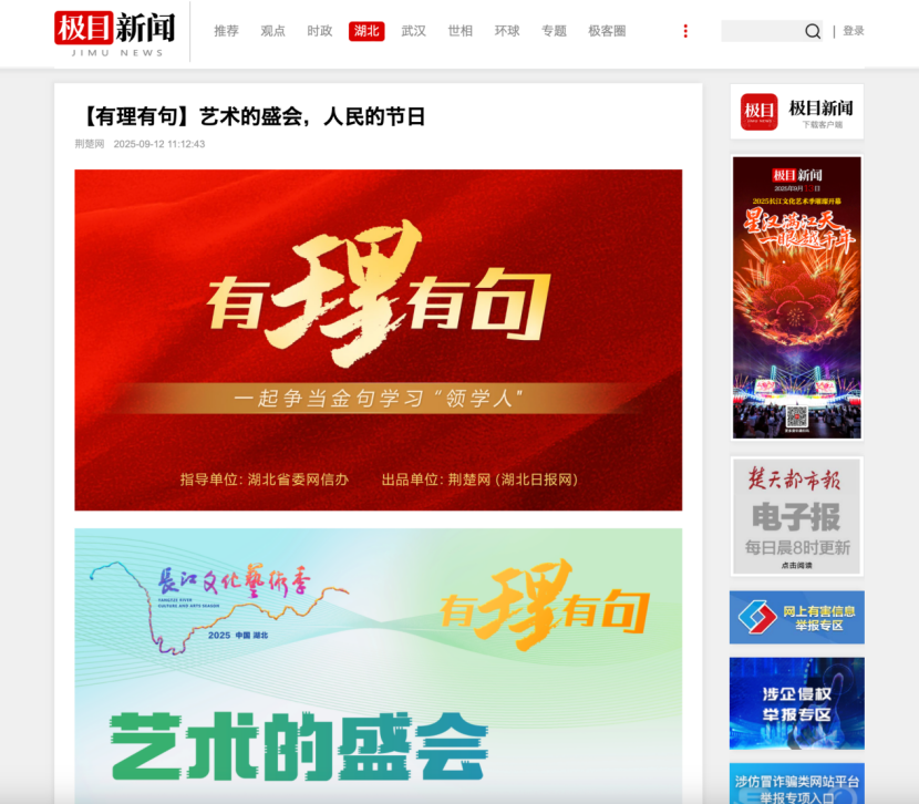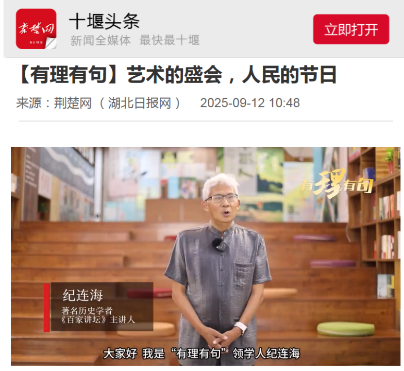 9月12日晚,2025長江文化藝術(shù)季盛大啟幕。由湖北省委網(wǎng)信辦指導(dǎo),湖北省新華書店(集團)有限公司、荊楚網(wǎng)(湖北日報網(wǎng))特別策劃“書香長江”閱讀周預(yù)熱視頻《【有理有句】藝術(shù)的盛會,人民的節(jié)日》,著名歷史學(xué)者紀連海邀約廣大市民讀長江、讀歷史、讀中國,成為當(dāng)晚的熱點話題。