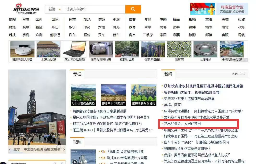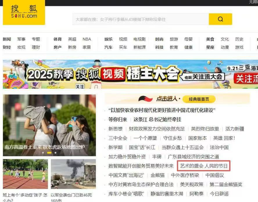 預(yù)熱視頻一經(jīng)發(fā)布,即獲全網(wǎng)轉(zhuǎn)發(fā)推薦。據(jù)大數(shù)據(jù)中心監(jiān)測數(shù)據(jù)顯示,截至9月13日中午,189家中央、省市級媒體報道《【有理有句】藝術(shù)的盛會,人民的節(jié)日》相關(guān)新聞,綜合Alexa網(wǎng)站排名、網(wǎng)站流量、網(wǎng)站訪問量、頁面瀏覽量等指標計算,該報道曝光量超過5800萬,形成刷屏式傳播。其中,新浪、騰訊、網(wǎng)易、搜狐、鳳凰網(wǎng)五大門戶網(wǎng)站在首頁首屏置頂。