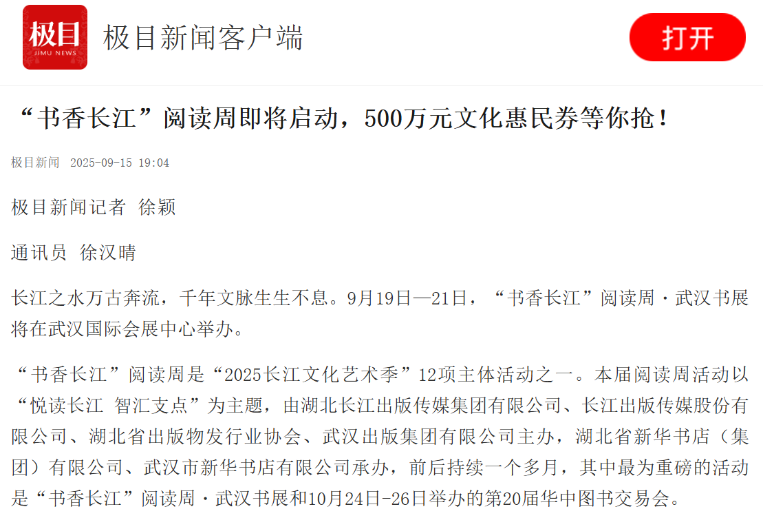 極目新聞 |“書香長江”閱讀周即將啟動,500萬元文化惠民券等你搶!
