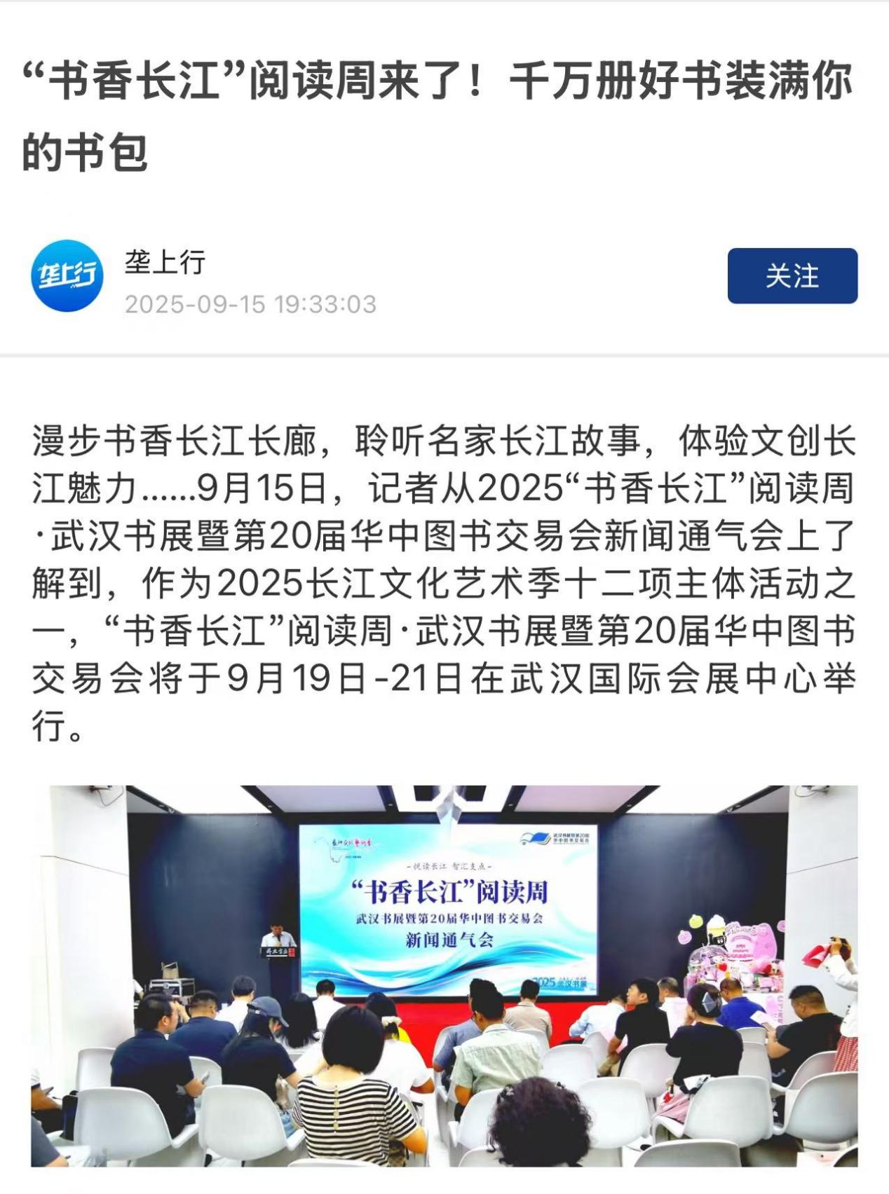 漫步書香長江長廊,聆聽名家長江故事,體驗文創(chuàng)長江魅力……9月15日,記者從2025“書香長江”閱讀周·武漢書展暨第20屆華中圖書交易會新聞通氣會上了解到,作為2025長江文化藝術(shù)季十二項主體活動之一,“書香長江”閱讀周·武漢書展暨第20屆華中圖書交易會將于9月19日-21日在武漢國際會展中心舉行。
