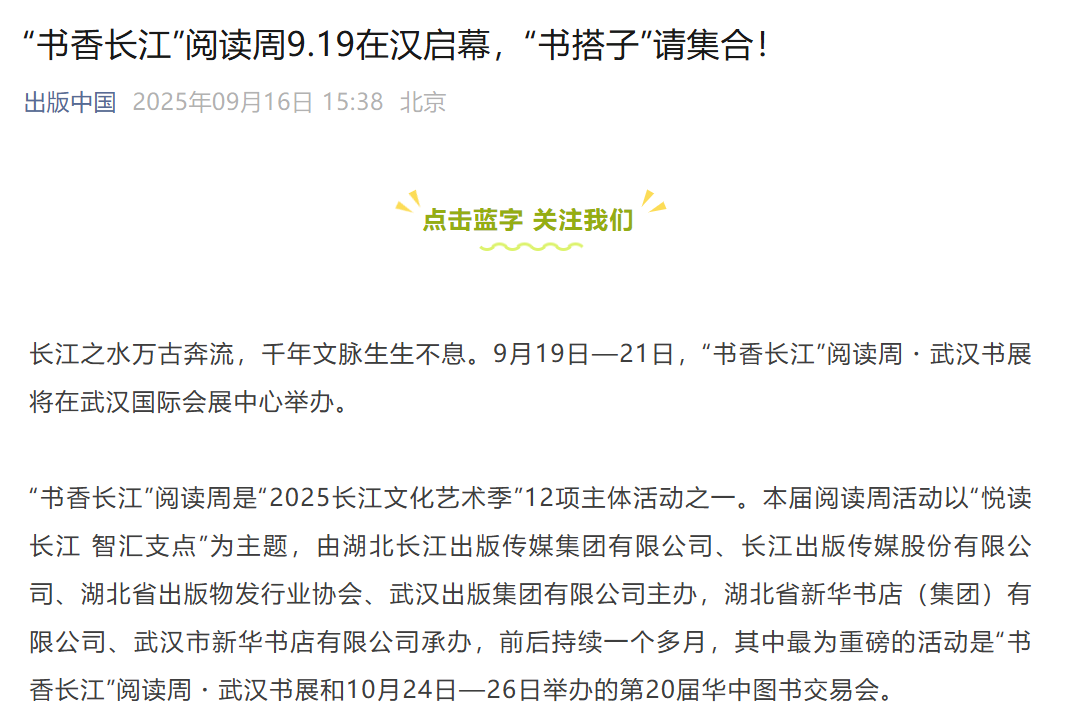 出版中國 |“書香長江”閱讀周9.19在漢啟幕,“書搭子”請集合!
