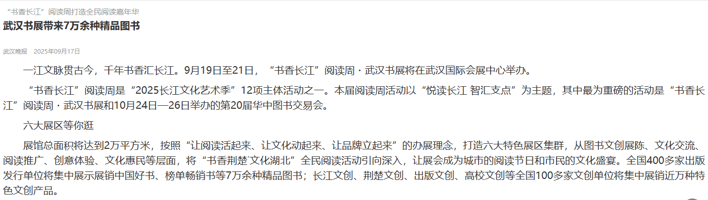 武漢晚報 |“書香長江”閱讀周打造全民閱讀嘉年華 武漢書展帶來7萬余種精品圖書