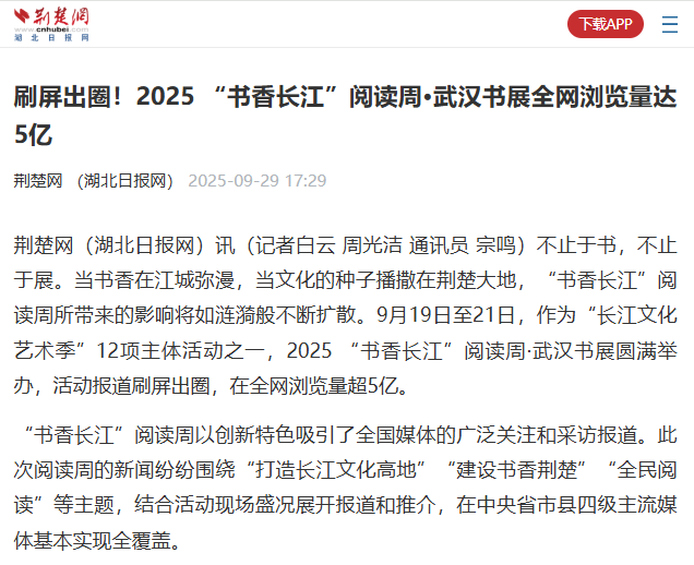 荊楚網(wǎng) | 刷屏出圈!2025 “書香長(zhǎng)江”閱讀周·武漢書展全網(wǎng)瀏覽量達(dá)5億