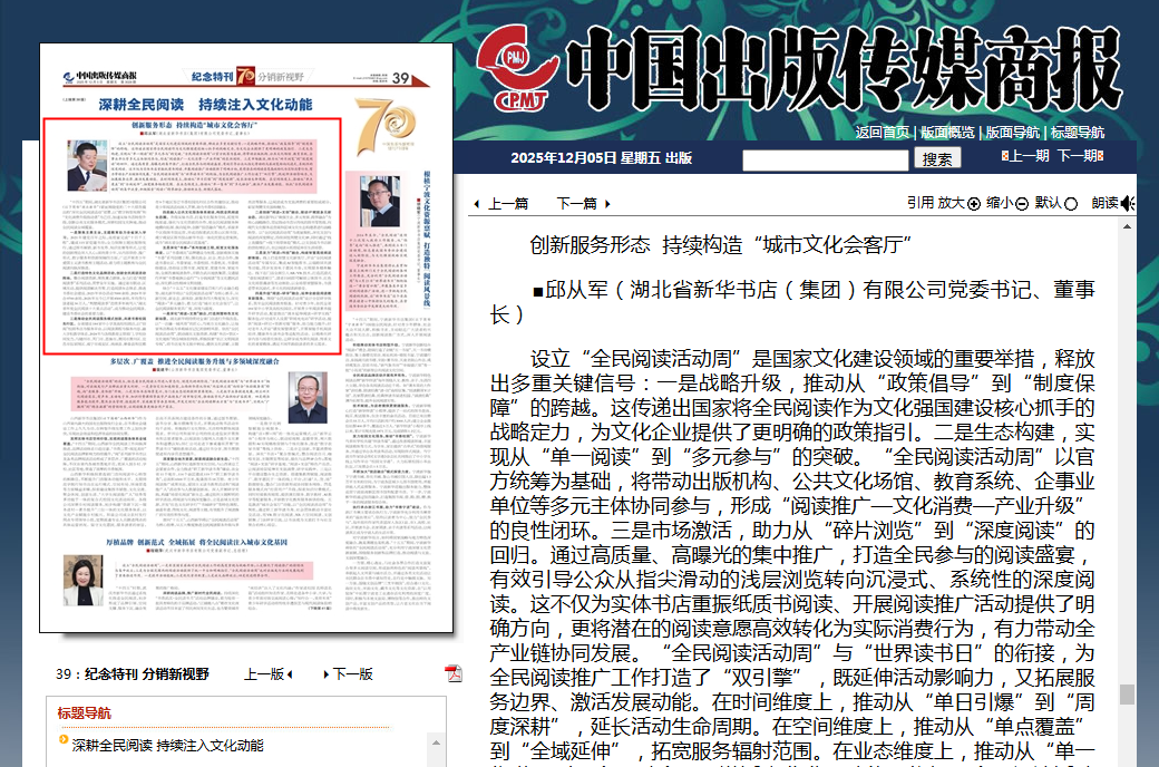 “十四五”期間,湖北省新華書(shū)店(集團(tuán))有限公司(以下簡(jiǎn)稱“湖北新華”)緊密圍繞黨的二十大報(bào)告提出的“深化全民閱讀活動(dòng)”部署,以“數(shù)字轉(zhuǎn)型先鋒”和“文化消費(fèi)升級(jí)推動(dòng)者”為己任,加速實(shí)體書(shū)店轉(zhuǎn)型升級(jí),創(chuàng)新公共文化服務(wù)模式,深耕校園文化陣地,推動(dòng)全民閱讀全域覆蓋。