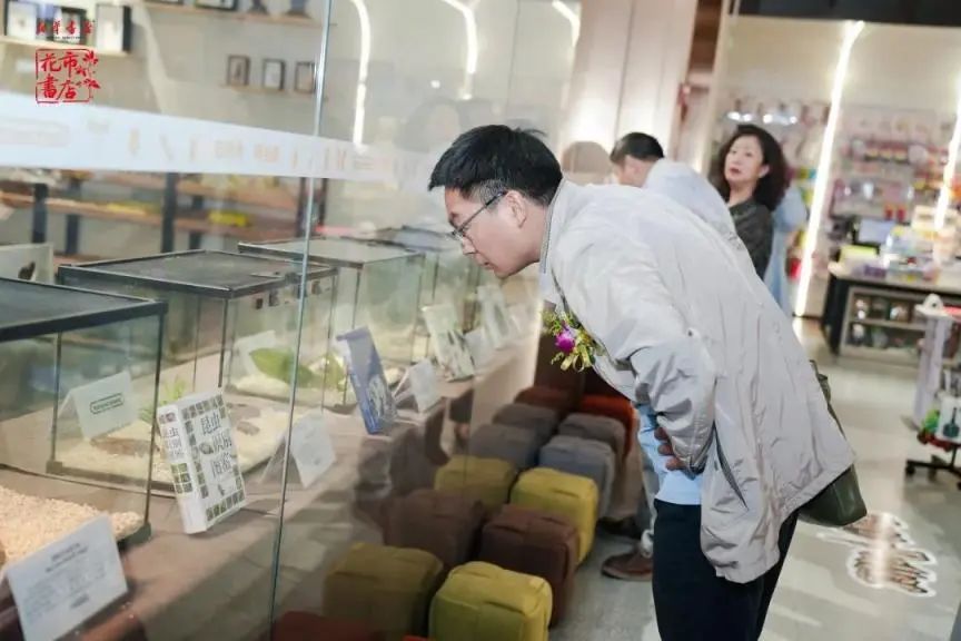 環(huán)境設(shè)計上,書店以“花市文化”為底色,四壁圖書構(gòu)筑“書山”,搭配鮮花綠植與科技展品,形成“移步換景、一書一世界”的探索感。一層中廳的鮮花綠植空間,將定期舉辦插花藝術(shù)、園藝課堂,呼應(yīng)“京師絹花出花市”的地域文脈;二層“閱蟲閣”引入自然元素,打造親子共讀的趣味角。