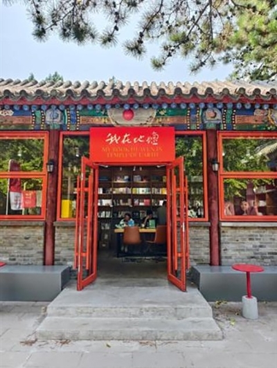 我在地壇書店位于地壇公園內(nèi),整個地壇的優(yōu)美及清涼就是它的特色場景。書店坐西朝東而開,它的背面有一棵樹冠頗大的柏樹遮陰,擋住了烈日對書店的西曬。北側(cè)和東側(cè)門口各有一棵高聳的松樹,形成雙松相護的景觀。南側(cè)則是一片草地,如茵之綠養(yǎng)眼,更養(yǎng)心。書店的門口有一個約30平方米的平臺,印著文學(xué)大家金句的簡易圍欄圈出一個十分文藝的小院。屋檐下的階沿設(shè)計為供人落座的座位。中午過后,這個小院即不再被太陽照射,成為人們歇腳的涼爽之地。進得書店,空調(diào)會送上溫度適宜的慰藉。讀者可以選一本書坐到供免費閱讀的長案前,也可以點一杯冷飲,由此進入書香沁人的時間。店內(nèi)靠窗有一排高椅,供讀者閱讀之用。從窗口望出去,地壇公園著名的銀杏大道盡入眼底。不少讀者在自媒體上都提到坐在這一排靠窗的座位,于地壇實地讀史鐵生的《我與地壇》的沉浸式體驗。這或許是我在地壇書店能夠給讀者提供的最獨特的價值。