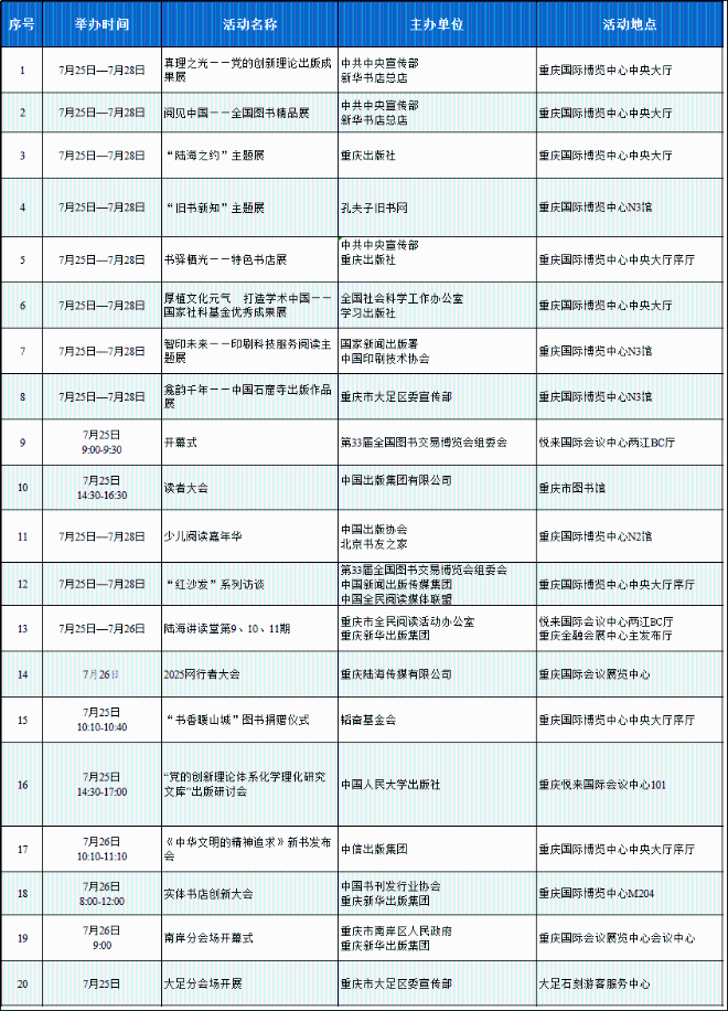 第33屆全國(guó)圖書(shū)交易博覽會(huì)(簡(jiǎn)稱(chēng)“書(shū)博會(huì)”)將于2025年7月25~28日在重慶兩江新區(qū)國(guó)際博覽中心舉辦。今年的書(shū)博會(huì)將有哪些精彩活動(dòng)亮相?