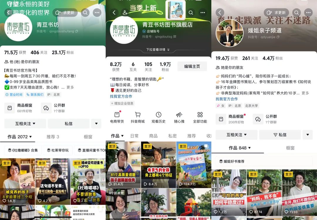 目前,抖音有3個主賬號加3個垂類矩陣賬號,其中,@青豆書坊有23萬+粉絲,主要帶貨方式是“直播+短視頻掛車”;@青豆書坊官方旗艦店有1.9萬+粉絲,以短視頻“掛車”為主;@媛姐親子頻道有4.4萬粉絲,以“建設(shè)達(dá)人人設(shè)+短視頻掛車”為主。