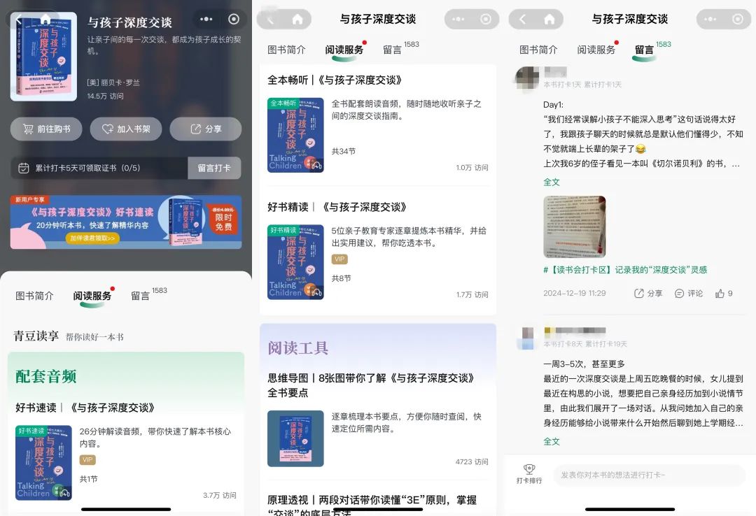當(dāng)用戶對我們的品牌和內(nèi)容有了信任度和認(rèn)知之后,自然會形成口碑“自傳播”。如今,在微信生態(tài)中,青豆的私域建設(shè)已初具成效:截至2024年年底,以“青豆讀享”微信小程序?yàn)槭?,已累積用戶72萬+;微信公眾號累積用戶近50萬+(包括“青豆讀享”微信服務(wù)號36萬+,“青豆書坊”微信訂閱號13萬+);企業(yè)微信累計(jì)好友數(shù)11.7萬;微信社群150+個,累積用戶2萬+人。