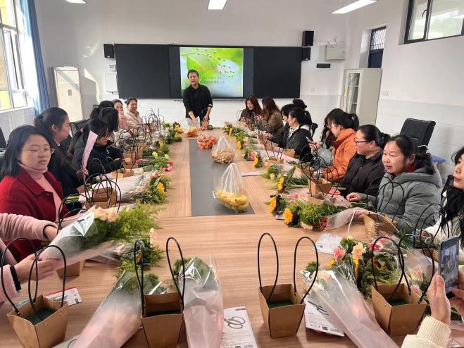 花藝?yán)蠋熓紫葹榻處焸冊(cè)敿?xì)講解了插花藝術(shù)的由來(lái)、鮮花的品種和寓意。再?gòu)幕ú倪x取、色彩搭配、枝葉綁剪等插花技巧進(jìn)行講授,并同步演示了插花工具的使用和插花步驟。在花藝?yán)蠋煹闹笇?dǎo)下,心靈手巧的教師們邊看邊學(xué),邊交流邊探討,充分發(fā)揮自己的想象力,將多種花材有層次地搭配在一起,一件件春意盎然、獨(dú)具匠心的插花作品應(yīng)運(yùn)而生?;顒?dòng)最后,教師們一起手拿自己完成的花束合影留念。