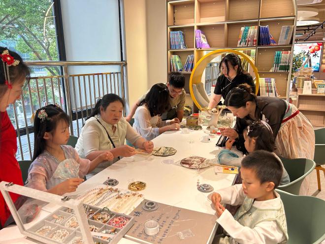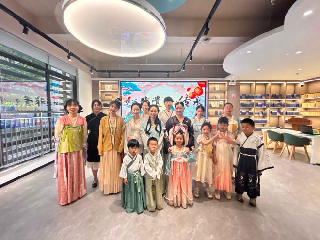 活動中,孩子們和家長身著精美的漢服,仿佛穿越時空,現(xiàn)場進行漆扇制作、古琴彈奏、茶藝品鑒、圍棋對弈等,展示傳統(tǒng)文化的非凡魅力。隨后,飛花令、投壺、套圈等趣味游戲?qū)⒒顒油葡蚋叱?。飛花令環(huán)節(jié),孩子們和家長或冥思苦想,或靈感乍現(xiàn),吟詠包含“風花雪月”的詩句,表現(xiàn)出扎實的文化底蘊和敏捷的思維能力。投壺游戲中,大家手持箭鏃,屏息靜氣,努力將木箭投入壺中,展現(xiàn)超強的專注力和精準度。套圈游戲充滿了歡聲笑語,大家手舞足蹈,力爭套中心儀的獎品。同時,悠揚的古琴聲不時回蕩,為活動增添了幾分詩意,大家仿佛置身于古代文人墨客的“雅集”之中,感受著那份悠然自得、超凡脫俗的情懷。