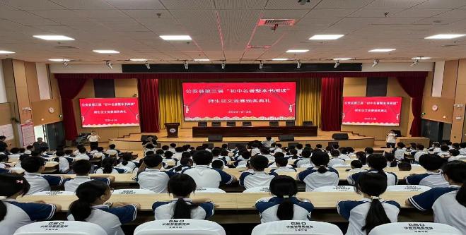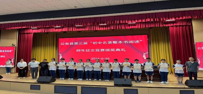 本網(wǎng)訊(通訊員彭凡、責(zé)任編輯葉珂)6月26日上午,由公安縣教育局主辦、新華書店公安縣分公司協(xié)辦的公安縣第三屆“初中名著整本書閱讀”征文比賽頒獎儀式在縣實驗初級中學(xué)舉行。縣教研室初中語文組主任黃發(fā)蓮、縣實驗初級中學(xué)校長魯峰、分公司副經(jīng)理肖忠及學(xué)校師生共計300余人參加儀式活動。