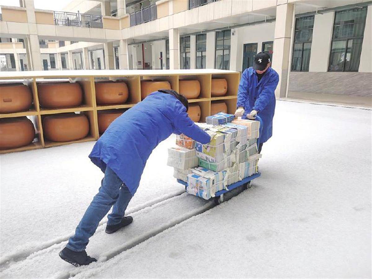 宜都市新華書店員工冒雪到陸遜小學配送教材。