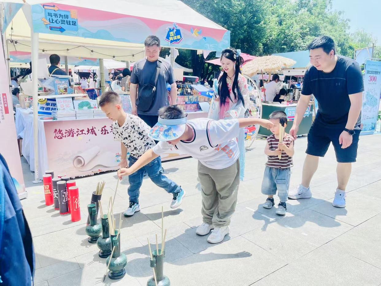 此次市集開展的“春和景明·古風(fēng)今韻”沉浸式體驗活動,既有“飛花令”詩詞競答、木射和投壺、手繪扇面等傳統(tǒng)文化活動,也有“閱影AI記”智能體驗、閱章打卡“贈語派對”、圖書漂流等互動活動,吸引了眾多游客和市民參與。市民李先生感嘆,作為老牌文化國企的新華書店,原來也很“年輕”、很時尚,現(xiàn)代創(chuàng)新與傳統(tǒng)文化深度共鳴。