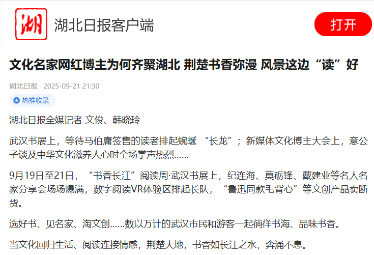 湖北日?qǐng)?bào)客戶端 | 文化名家網(wǎng)紅博主為何齊聚湖北 荊楚書香彌漫 風(fēng)景這邊“讀”好