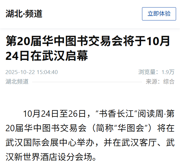 10月24日至26日,“書香長江”閱讀周·第20屆華中圖書交易會(簡稱“華圖會”)將在武漢國際會展中心舉辦,并在武漢客廳、武漢新世界酒店設(shè)分會場。