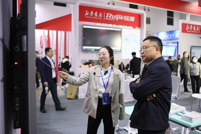 展會首日,中國教育裝備行業(yè)協(xié)會副會長夏國明、湖北省教育廳教育技術(shù)裝備處處長朱圣芳蒞臨展位,并聽取文教公司負責人李明輝作相關(guān)介紹。兩位領(lǐng)導對新華書店集團近幾年在教育裝備、教育信息化領(lǐng)域取得的成績表示肯定,希望新華書店集團繼續(xù)發(fā)揮國有文化企業(yè)的優(yōu)勢,致力于湖北省教育裝備行業(yè)的蓬勃發(fā)展,服務(wù)好廣大師生,共同筑牢行業(yè)發(fā)展基石。